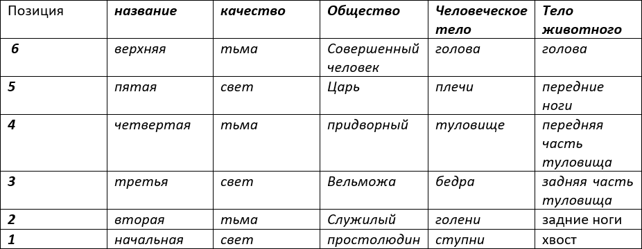 4. Если в позициях 1–4, 2–5, 3–6 располагаются различные черты (Инь и Ян), то такие позиции рассматриваются особо. Считается, что между ними есть соответствие. Если черты одинаковые, то между ними нет соответствия, т. е. свет не тяготеет к тьме и наоборот.