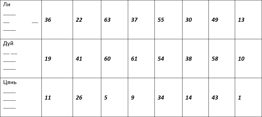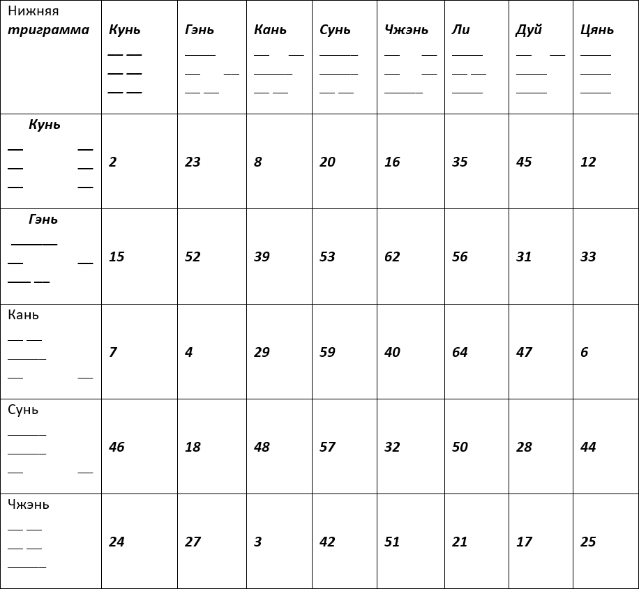 А сейчас познакомьтесь с основной таблицей книги, которая поможет определить номер гексаграммы: