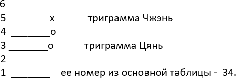 Не убирая далеко основную таблицу триграмм, мы находим вплетенную триграмму, состоящую из внутренних черт основной триграммы, она позволит узнать нам о самом процессе ремонта, как он будет проходить, прежде чем будет получен итоговый результат в гексаграмме 34. Вспоминайте, мы рисуем (с низа в вверх) 2, 3,4,3.4,5 черты 34-ой гексаграммы.
