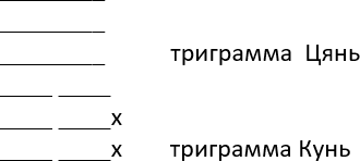 8. Когда выпадает три орла – старый Ян и три решки – старый Инь, эти черты называются подвижными – яо и меняются на противоположные, т. е. строиться вторая триграмма, которая и будет итогом вашего вопроса. Например: