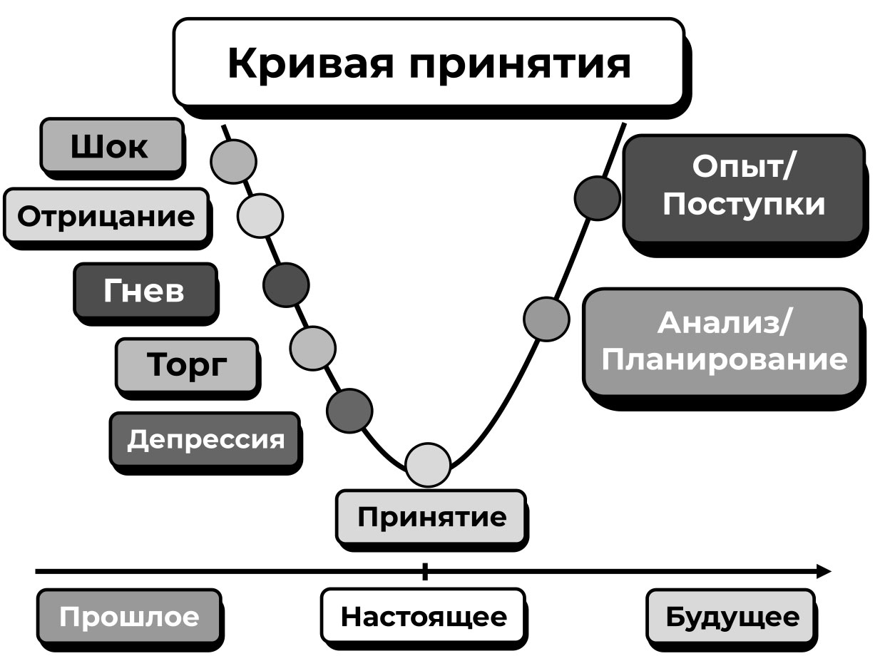 Рассмотрим кривую принятия, по-другому ее еще называют кривой проживания стресса. Именно эти чувства мы испытываем в самом начале, когда получаем неприятную информацию, или если вдруг сами понимаем, что что-то идет не так, или если происходит какое-то событие, которое приводит нас к осознанию проблемы.