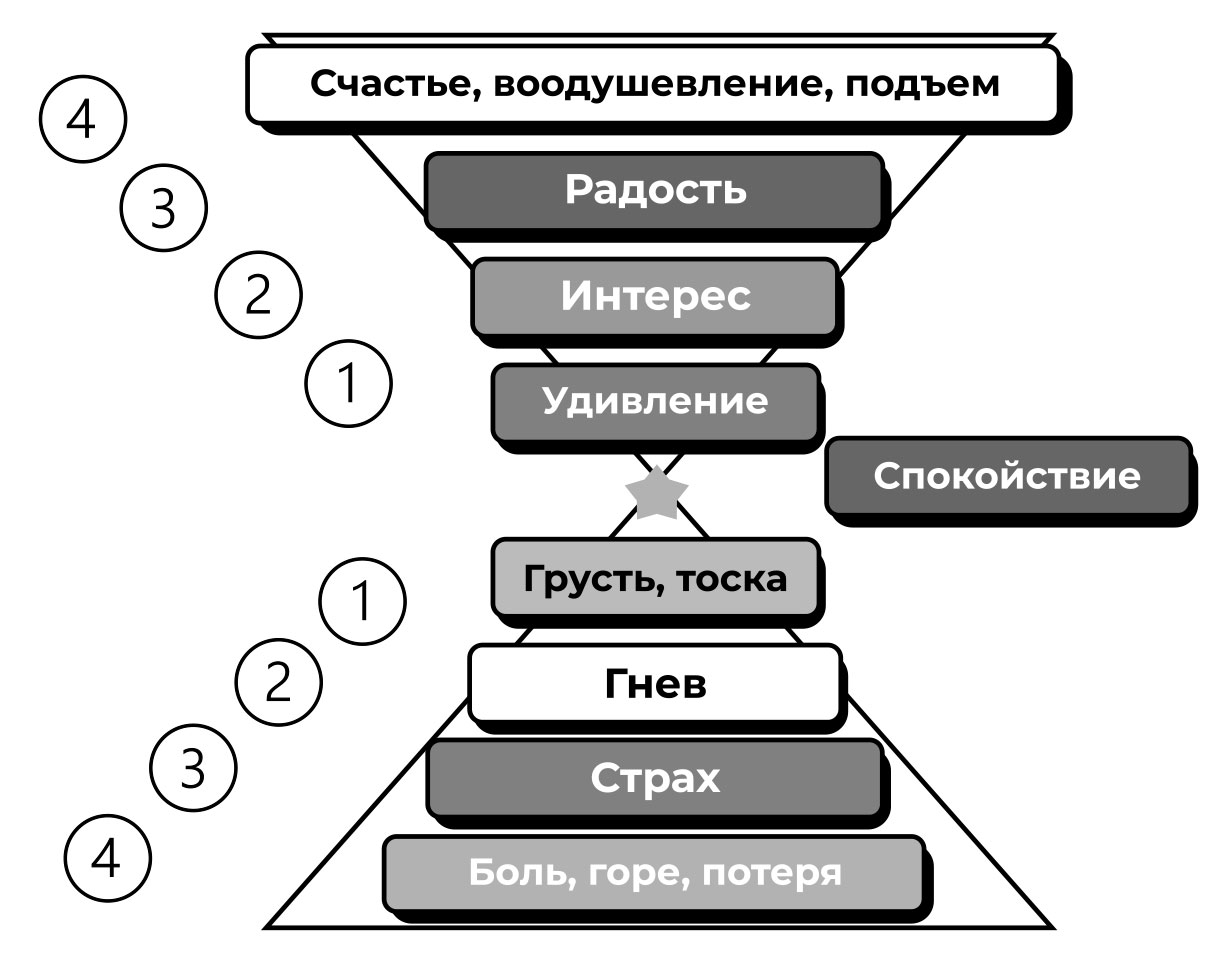 Кроме того, все разводятся по-разному. И вовсе не обязательно по-человечески. Одни что-то делят, другие воруют документы, третьи ходят к гадалкам. И в результате грусть и тоска остаются с нами надолго. А еще мы любим постонать и поныть – прямо выгоду какую-то получаем от этого. Может быть, потому что в этом случае нас все жалеют. Хорошо бы, если в таком состоянии нас сразу увольняли с работы: чтобы мы могли быстрее взять себя в руки и начать новую жизнь. Но этого не происходит. В итоге мы грустим, а сами при этом хотим испытывать счастье, подъем, эйфорию. Кстати, не забудьте, что эйфория – это тоже нездоровое эмоциональное состояние, которое сопровождается нетрезвым мышлением и поведением. Лучше остановиться на интересе и удивлении. Даже если вы находитесь внизу пирамиды, то есть испытываете боль, горе и потерю, то попытайтесь отнестись к этому с интересом и удивлением: «Ничего себе, в каком я состоянии! Ничего себе, до чего я дошла!» Конечно, хорошо бы для начала преодолеть отрицание и себя в нем увидеть: «Уже не хочется надевать что-то новое, пойду в чем есть» или «Я не пойду с подружками на танцы и праздники не буду устраивать».