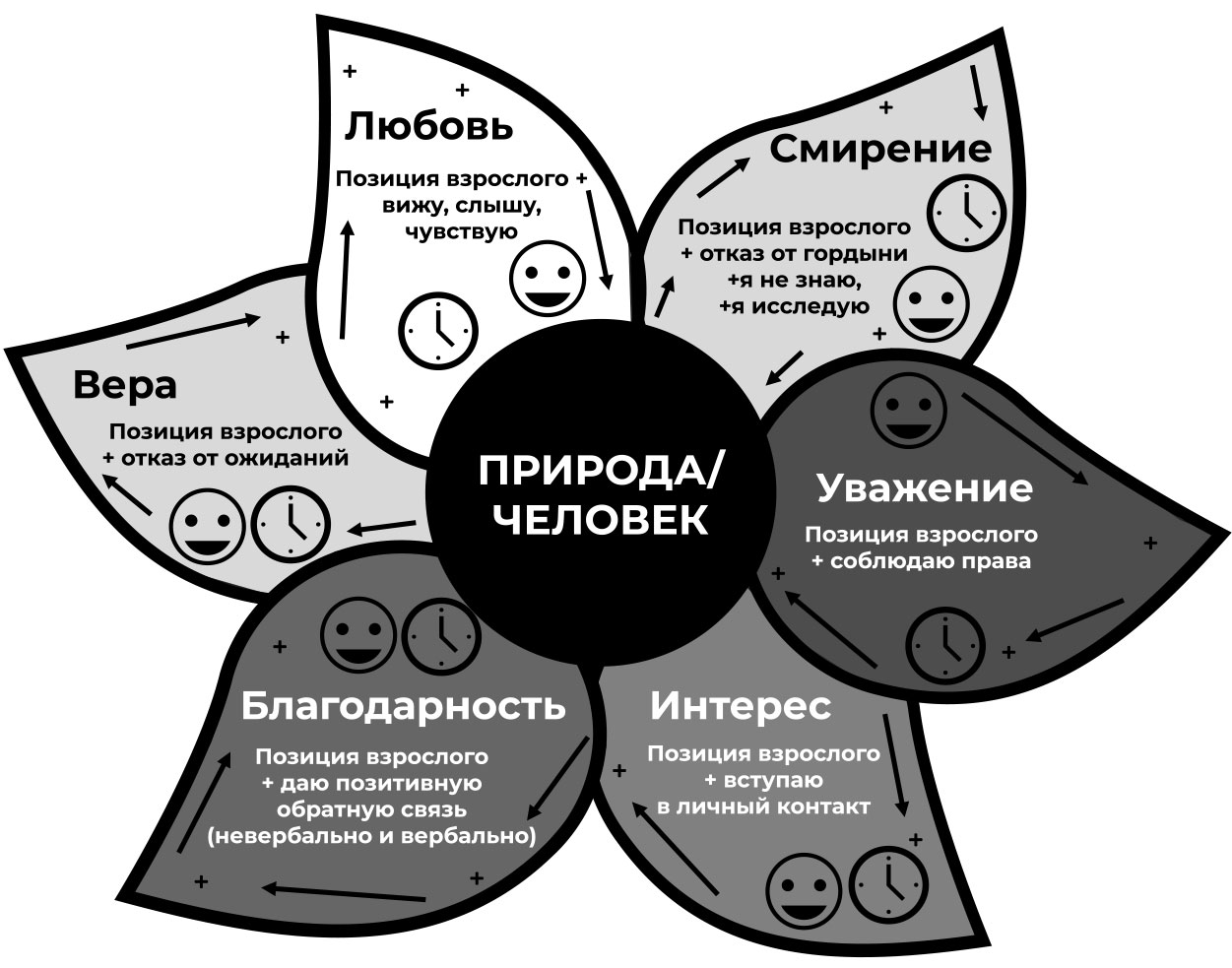 Обратимся к схеме развивающего диалога. В центре находятся природа и человек. Понимаете, что ваш бывший муж такой же человек, как и вы? Чтобы принять его, простить и отпустить с благодарностью, мысленно посадите его в центр и постарайтесь выполнить действия с каждого лепестка. Это тяжелая работа над собой. И, конечно, посадите себя в этот центр, потому что, когда вы здесь, вас безусловно любят, безусловно уважают, с вами хорошо и без гордыни взаимодействуют, проявляют истинный интерес, благодарят. И вы безусловно любите, безусловно уважаете, благодарите, и ожидания уходят навсегда. Иными словами, старайтесь всегда быть в центре, и тогда решатся все ваши проблемы.