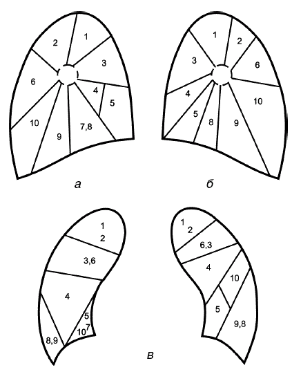 Верхние левая и правая доли делятся на три сегмента: верхневерхушечный – 1; верхнезадний – 2; верхнепередний – 3. Средняя доля справа делится на два сегмента: среднебоковой – 4; среднепередний – 5. В левом легком средней доле соответствует язычковая, также состоящая из двух сегментов: верхнеязычкового – 4; нижнеязычкового – 5. Нижняя доля правого легкого делится на пять сегментов: базально-верхушечный – 6; базально-медиальный – 7; базально-передний – 8; базально-боковой – 9; базально-задний – 10. Нижняя доля левого легкого делится на четыре сегмента: базально-верхушечный – 6; базально-передний – 8; базально-боковой – 9; базально-задний – 10 (рис. 1).