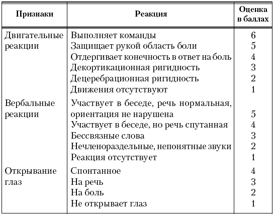 При определении уровня сознания по шкале комы Глазго каждую реакцию оценивают в баллах. Общая оценка получается путем сложения баллов по каждой из трех групп признаков. Уровень сознания выражается суммой баллов. Оценка менее 9 баллов свидетельствует о тяжелом повреждении ЦНС.
