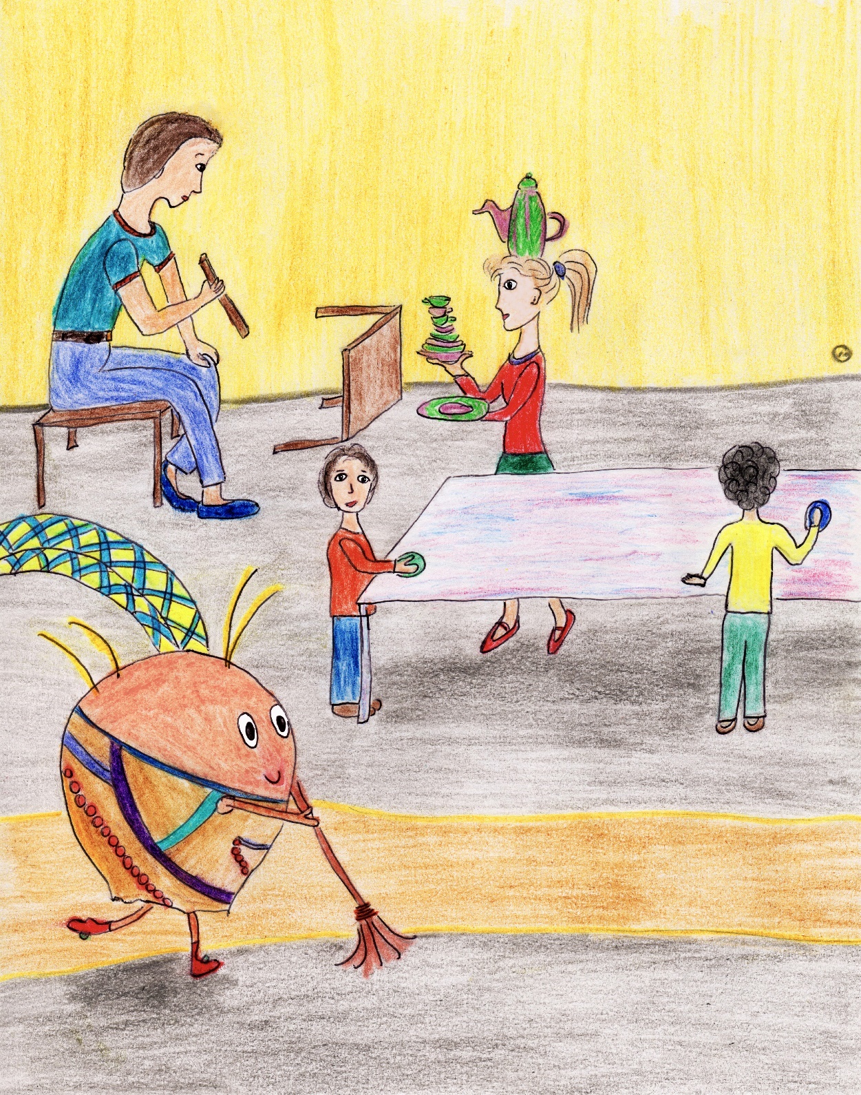 И вот настал торжественный день, когда мужчина с усами это оказался сам режиссёр – объявил из всех детей лучшую пятерку. Вначале все собрались за столами, ели, пили, шутили и пели, потом танцевали, и, наконец, прозвучали имена лучших слуг. Одной из них оказалась Земля! Она была в восторге! А в завершении празднества победители вызвались прибрать за всеми зал, как настоящие слуги.