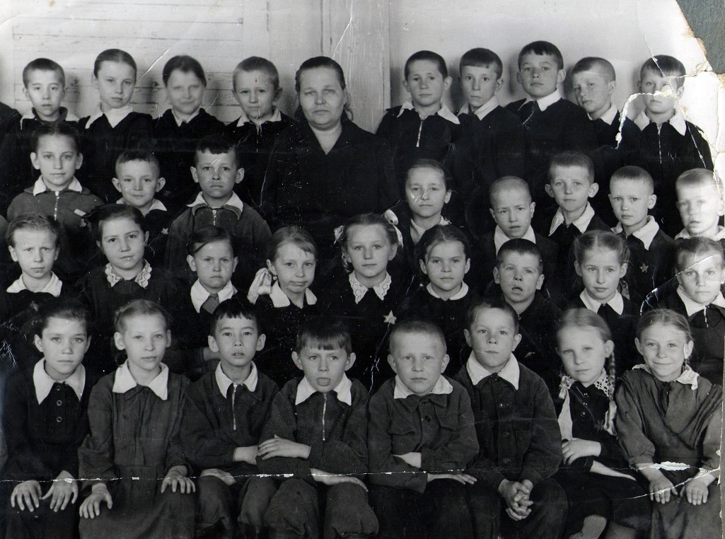 На фото: Наташа под учительницей справа, с пришитой звёздочкой, 1 класс, 1959г., Зима