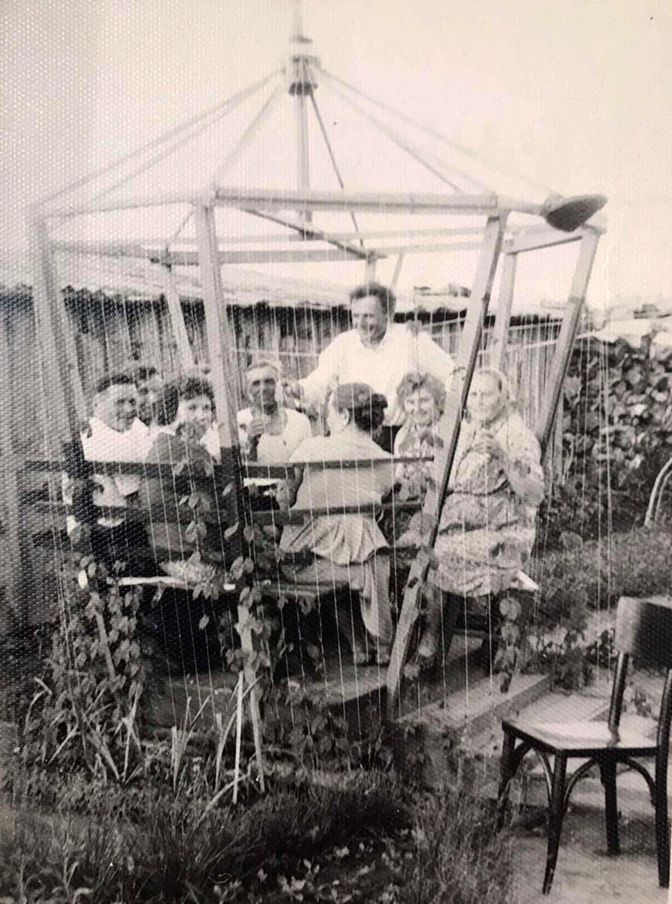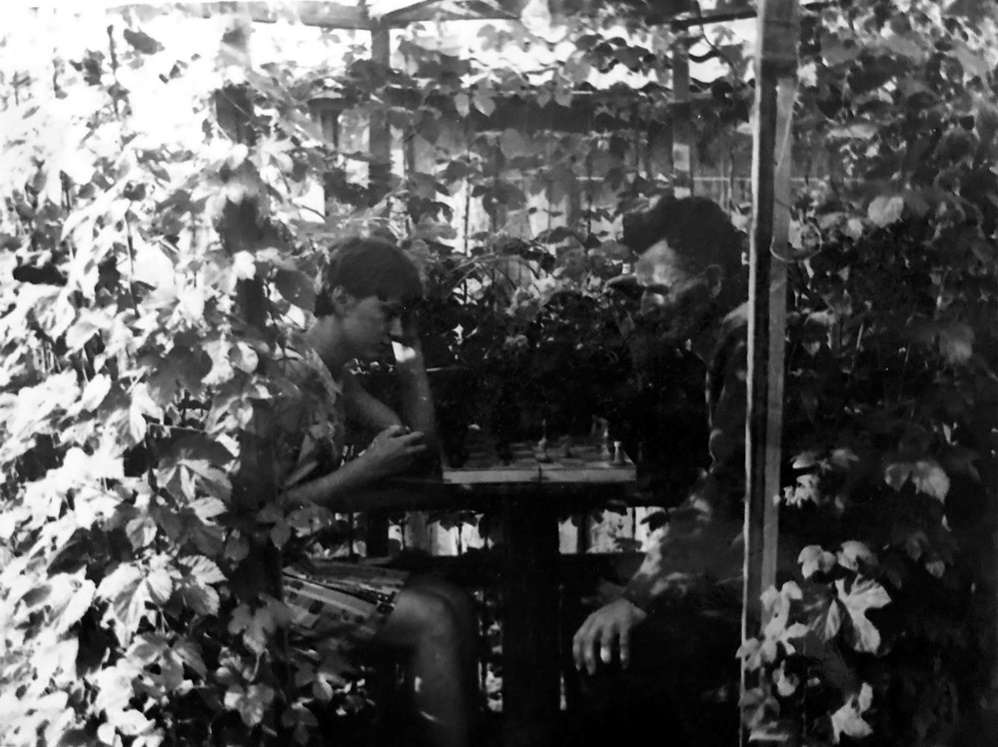 Во дворе дома они сажали высоченные георгины разных сортов, на зиму выкапывали и хранили клубни в подвале. Французская сирень была, пахла на двести метров. Они обожали цветы, в то время как никто особо цветами в деревне не занимался. А им всё надо было. Во дворе дома они сделали уютную беседку. Из деревянных реек каркас восьмиугольной формы, расширяющейся кверху, и конусообразная крыша. Натянули бечевку, принесли из леса хмель, подсадили его под беседкой, и со временем каркас затянуло живое зелёное полотно.