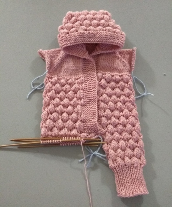 1 ряд: набираем 2 петли по краю переда комбинезона, затем вяжем 26 лицевых рукава, затем набираем 4 петли по краю спинки комбинезона (2+26+4=32)