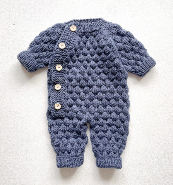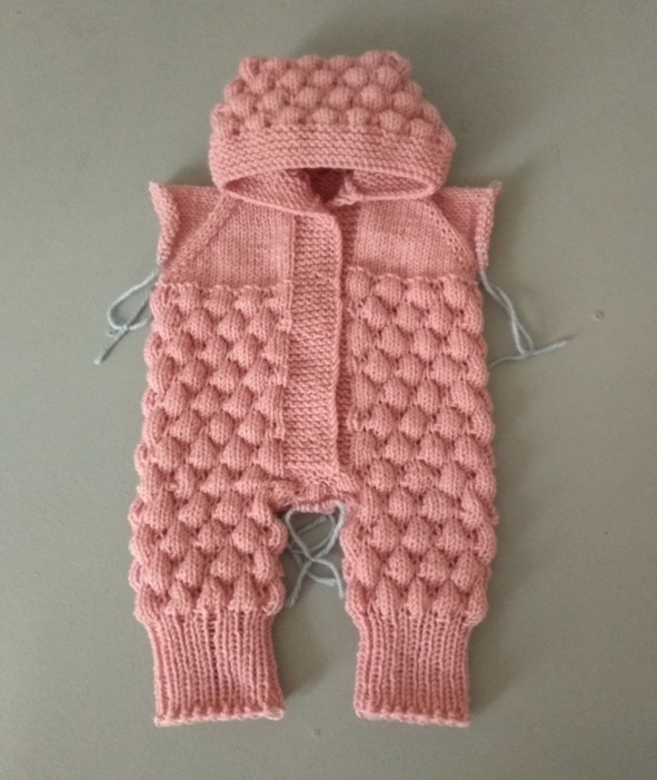 Проводим ВТО комбинезона, сушим на горизонтальной поверхности. Пришиваем 5 пуговок. Комбинезон готов.