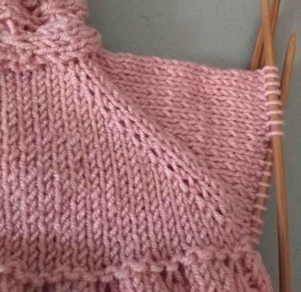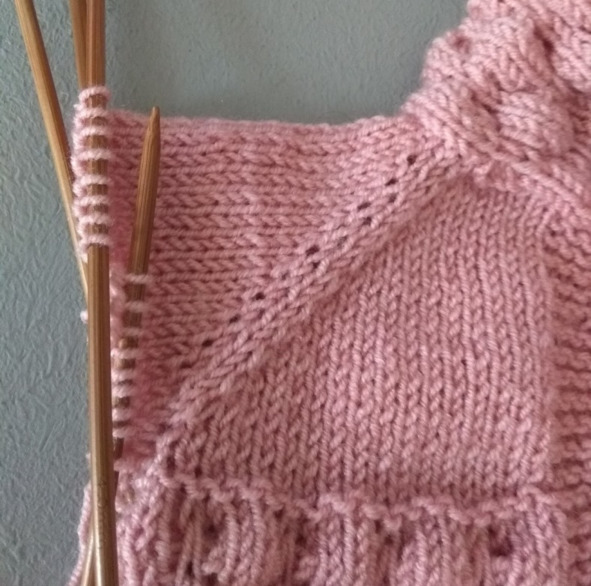 15 ряд: кромочная, 6 лицевых, прибавка из протяжки, 19 лицевых, прибавка из протяжки, 2 лицевых реглана, прибавка из протяжки, 11 лицевых, прибавка их протяжки, 2 лицевых реглана, прибавка из протяжки, 23 лицевых, прибавка из протяжки, 2 лицевых реглана, прибавка из протяжки, 11 лицевых, прибавка их протяжки, 2 лицевых реглана, 6 лицевых, 1 изнаночная