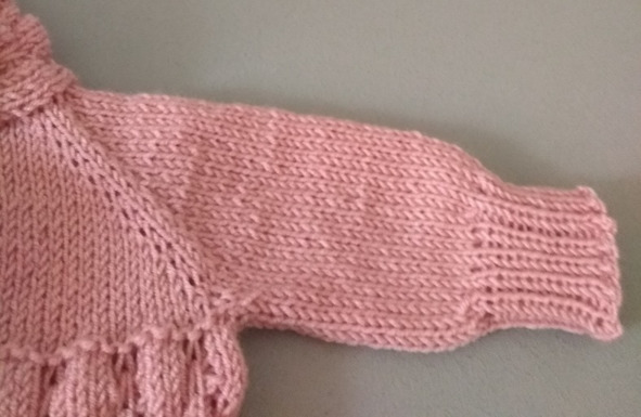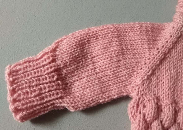 С 25 ряда начинаем вязать резинку (1 лицевая, 1 изнаночная). Вяжем резинку 14 рядов и закрываем 28 петель. Левый рукав готов.