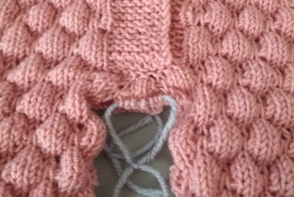 17 ряд: кромочная, 6 лицевых, прибавка из протяжки, 4 лицевых, распустить вниз 4 ряда и петлю нижнего ряда провязать лицевой через все распущенные ряды (3 лицевых, распустить вниз 4 ряда и петлю нижнего ряда провязать лицевой через все распущенные ряды) – повторить 3 раза, 4 лицевых, прибавка из протяжки, 2 лицевых реглана, прибавка из протяжки, 4 лицевых, распустить вниз 4 ряда и петлю нижнего ряда провязать лицевой через все распущенные ряды, 3 лицевых, распустить вниз 4 ряда и петлю нижнего ряда провязать лицевой через все распущенные ряды, 4 лицевых, прибавка их протяжки, 2 лицевых реглана, прибавка из протяжки, 4 лицевых, распустить вниз 4 ряда и петлю нижнего ряда провязать лицевой через все распущенные ряды (3 лицевых, распустить вниз 4 ряда и петлю нижнего ряда провязать лицевой через все распущенные ряды) – повторить 4 раза, 4 лицевых, прибавка из протяжки, 2 лицевых реглана, прибавка из протяжки, 4 лицевых, распустить вниз 4 ряда и петлю нижнего ряда провязать лицевой через все распущенные ряды, 3 лицевых, распустить вниз 4 ряда и петлю нижнего ряда провязать лицевой через все распущенные ряды, 4 лицевых, прибавка их протяжки, 2 лицевых реглана, 6 лицевых, 1 изнаночная