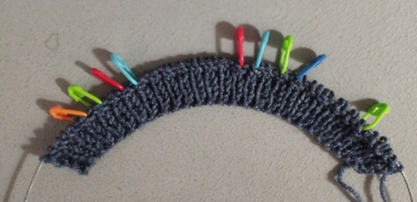 Затем удаляем контрастную нить с петель ластовицы и сшиваем петли передней и задней части ластовицы между собой иголкой трикотажным швом (смотрите фото)