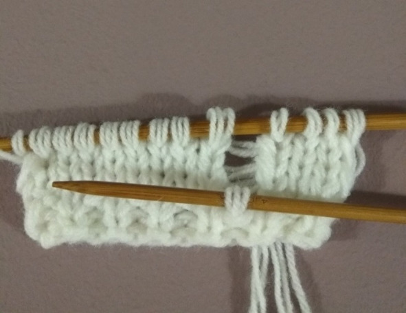 15 ряд: 1 лицевая, распустить вниз 6 рядов и петлю нижнего ряда провязать лицевой, (3 лицевых, распустить вниз 6 рядов и петлю нижнего ряда провязать лицевой) – повторить 8 раз, 2 лицевых