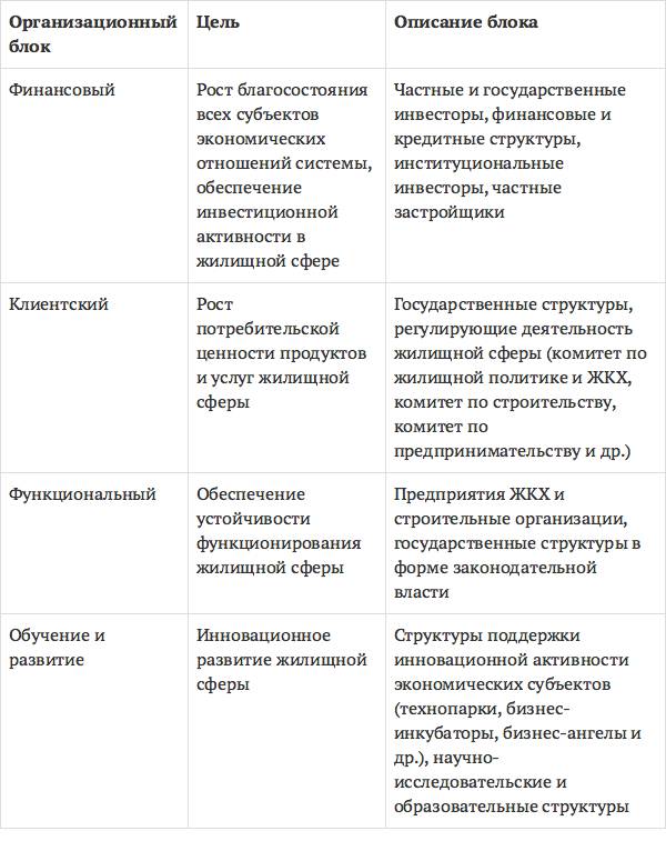 Организационная структура системы «жилищная сфера» с учетом четырех организационных блоков представлена в табл. 1.2.