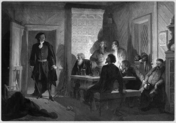 Адольф Шарлемань «Петр I накрывает заговорщиков в доме Цыклера 23 февраля 1697 года», 1884, холст, масло