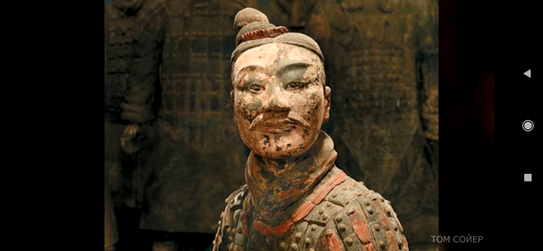 – Терракотовую разумеется. И началось. Зрелище открылось миру поистине великолепное. Воины в полный рост стоящие стройными рядами. Да, они ещё были разноцветные. Возникало такое ощущение, что они созданы только вчера. Но как только солдаты вечности встречали солнечные лучи своей Поднебесной, у всех на глазах фигуры превращались в глиняные одноцветные, терракотовые скульптуры. Под действием света и воздуха краска, которая сохранилась две тысячи лет, молниеносно исчезала.