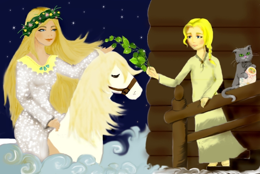 Озарилось вокруг всё. Невольно Полинка глаза открыла. Таким теплом лицо и тельце её обдало, точно солнышко с небес спустилось, лучами дотронулось. Видит божество перед собой в полупрозрачном образе юной девушки, восседающей на белом коне, по обе стороны которой лучезарные всадники. Девушка ослепительной красоты, волосы длинные цвета зрелых колосьев пшеницы распущены, в голове венок луговых цветов, глаза зелёные. Платье ее белое, золотым бисером расшито. Обратилась она к девочке с нежностью: – Здравствуй, Поленька. Я Берегиня. Зовут меня Радимира. Обронила я случайно свой атрибут священный. Сила в нём неимоверная, целебная. Знаю, что у тебя моя берёзовая веточка. Дарует она на земле плодородие и защиту, помогает спасти сотни живых существ.
