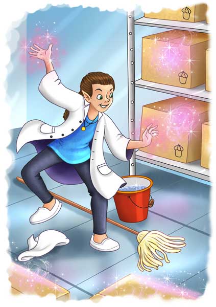 Невидимки устроились на диване и принялись ждать. По цеху туда-сюда сновали самоходные тележки, время от времени заходили какие-то люди в белых халатах и колпаках. Они пересчитывали коробки, обсуждали производственные вопросы, но никто и не собирался колдовать. Прождав около часа и уже отчаявшись, друзья вдруг обратили внимание на пожилую уборщицу, тщательно натиравшую стеклянные двери. Это была худенькая женщина небольшого роста в белом халате. Такие носили все на этом предприятии. Её волосы были подвязаны белым платком, низко опущенным на лоб. Тщательно протерев створки, она удовлетворённо оглядела свою работу. Затем неожиданно для наблюдавших за ней невидимок воровато оглянулась. Убедившись, что поблизости никого нет, уборщица взяла в руки ведро, швабру и с несвойственной её возрасту прытью подбежала к двери, плотно её закрыла и замкнула на ключ. Замерев, невидимки наблюдали за действиями странной сотрудницы фабрики.