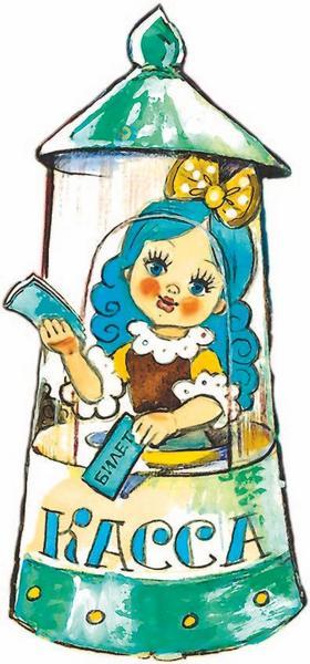 Мальвина продавала билеты на представление театра «Молния». Это был тот самый театр, который Буратино и его друзья увидели, когда открыли Золотым ключиком потайную дверцу и спустились по крутой каменной лестнице в подземелье. Теперь театр стоял на Приморской площади, и к кассе тянулась длинная очередь мальчиков и девочек, желающих посмотреть весёлую комедию о том, как деревянный человечек сумел перехитрить злого Карабаса Барабаса. Детям так нравилась эта комедия, что они смотрели её по нескольку раз. Стоя в очереди, ребята распевали под звуки шарманки полюбившуюся им песенку Буратино:
