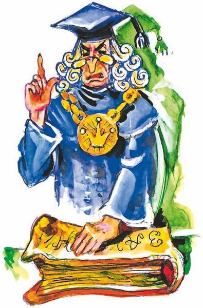 В просторном зале суда на особом возвышении сидел судья, очень важный и строгий. На его голове красовалась чёрная бархатная шапочка, с плеч свисала мантия, а на шее блестела тяжёлая бронзовая цепочка. Было сразу видно, что с таким господином спорить нельзя. Перед судьёй на длинной скамье сидел Карабас Барабас со своей компанией. Бедному папе Карло сразу стало не по себе.