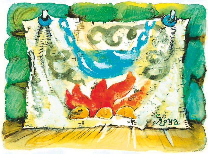 – Художник хотел, чтобы на сцене выступали не только куклы, но и маленькие зверята: обезьянки, страусята, попугайчики, черепашки, и он поплыл за ними обратно на свой остров. А пока, до своего возвращения, запер Золотым ключиком дубовую дверцу и занавесил её картиной с изображением котелка, кипящего на огне.