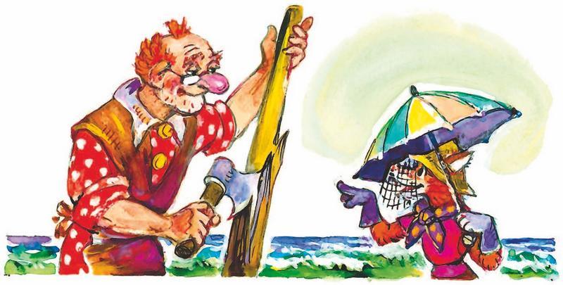 Лиса аккуратно перешла на борт по доске, а кота Базилио пришлось перетаскивать Дуремару, потому что кот не хотел мочить лапы.