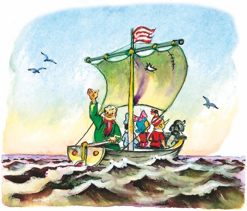 Джузеппе укрепил парус, а папа Карло перенёс свои пожитки и кукол на кораблик и сел на корме.