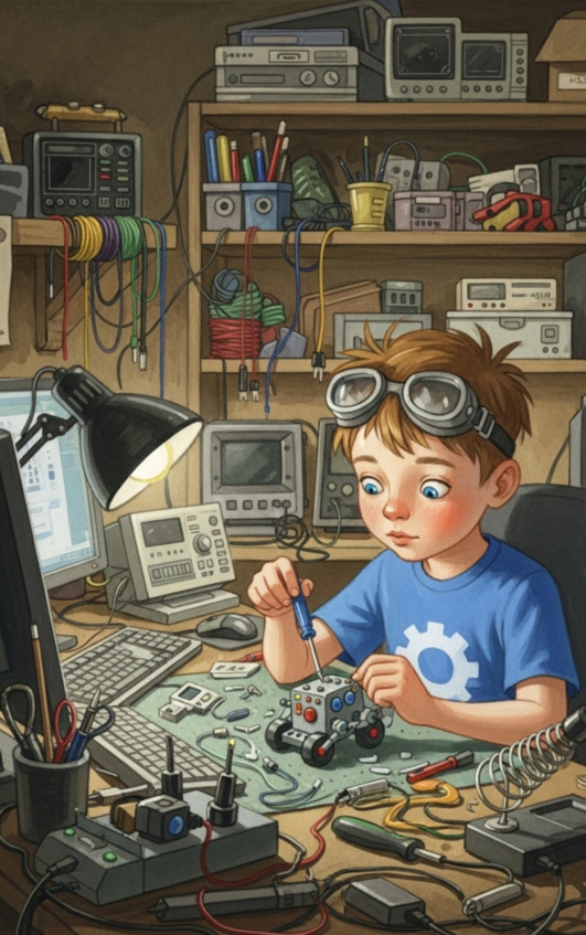На полках, рядом с книгами по роботам и программированию, мирно лежали разобранные будильники, старые радиоприёмники и платы с крошечными деталями. В центре стоял большой стол, усыпанный инструментами: маленькими отвёртками, паяльником с тонким кончиком и блестящей проволокой для пайки, похожей на серебро.