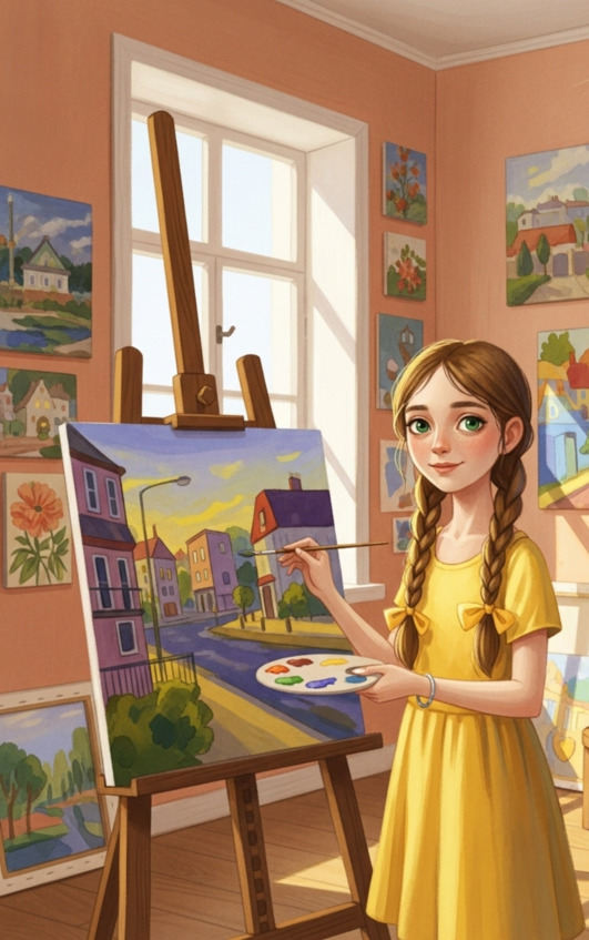У окна стоял большой деревянный мольберт. На нём красовалась почти готовая картина: их двор, по-Милиному волшебный – качели улетают в небо, как воздушные змеи, а в песочнице сверкала золотая пыль, как в сказке. В комнате приятно пахло красками и свежей бумагой.