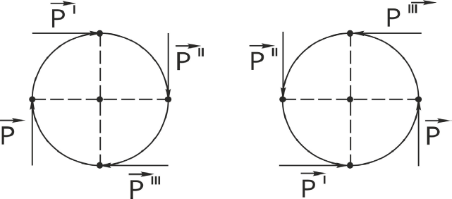 Для объяснения подобной «аномалии» воспользуемся масштабированием, увеличив точку до видимых размеров круга. Так как абсолютное значение импульса γ-кванта (света) при распространении в привычном нам пространстве не должно меняться, то картинка рисунка 2 при увеличении будет иметь только два возможных варианта, изображенных на рисунке 3, и никак иначе, во избежание компенсации импульсов, то есть их обнуления. Здесь сразу хочется отметить, что импульсы на рисунке 3 изображены не так, как принято в физике (т. е. исходящими из точки приложения), потому что это импульсы внутреннего энергетического пространства, воздействующего на внешнее физическое.