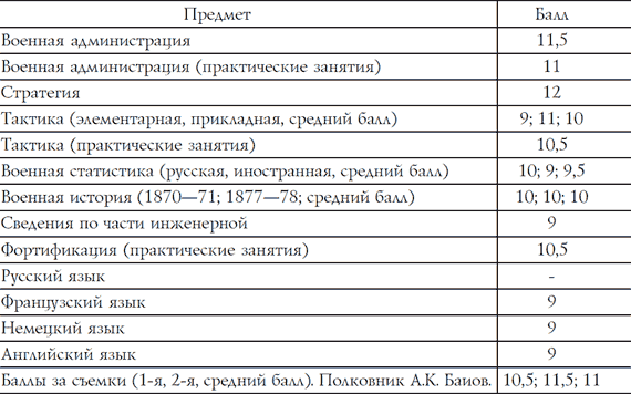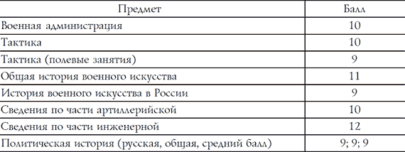 Годы учебы были серьезным испытанием для слушателей академии, учебный курс которой был достаточно труден, а программа, по мнению многих выпускников, перегружена201. В чем-то такой подход являлся оправданным, ведь от полученных слушателями навыков зависели жизни людей и исход боевых действий. Основной курс обучения в академии был разделен на два годичных класса (младший и старший) и состоял как из теоретических, так и из практических занятий. Главными предметами являлись тактика, стратегия, военная администрация, военная история, военная статистика, геодезия, вспомогательными – русский язык, сведения по части артиллерийской и инженерной, политическая история, международное право, иностранные языки. Что касается иностранных языков, то изучение как минимум одного из них являлось обязательным, два других языка можно было изучать по желанию. Между слушателями академии существовала острая конкуренция, связанная с рейтинговой системой оценок при выпуске.