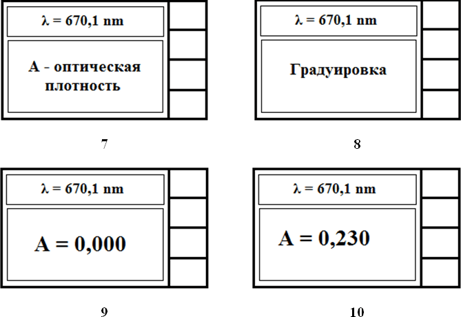 7. Нажмите клавишу «#» на панели управления. В нижней части светового табло на верхней строке появится надпись «Градуировка» (8), а через 3–5 секунд надпись «Измерение». На нижней строке появится измеренное значение оптической плотности холостой пробы (воды), например «А = 0,000» (9). Оно должно составлять 0,000±0,002. Если значение А имеет большее отклонение от нуля, необходимо повторно провести градуировку (нажать «#»).