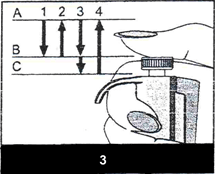 4. Выпустите взятый раствор, плавно нажимая на кнопку до первой остановки (В). После примерно секундной паузы нажмите операционную кнопку до второй остановки (С). После выполнения данной операции наконечник должен полнocтью опустошиться.