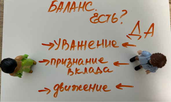 Размещение фигур: клиент ставит свою фигуру чуть дальше от коллеги, выражая дистанцию и напряжение.