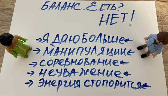 Если каждый из нас уверен, что его страдания и вклад больше, чем вклад другого. И машина с ребенком используются как предлоги для приобретения каких-то очков или как объект для манипуляций. Если движение системы застопорилось и каждый считает, что он дал больше, баланса нет.