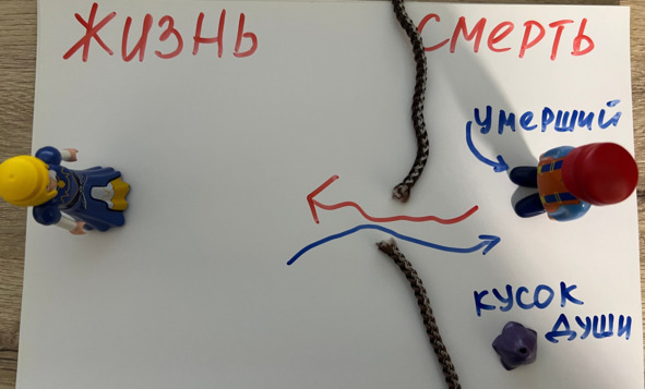 Поместите фигуру, символизирующую вас, в пространстве жизни, и фигуру умершего – в пространстве смерти.
