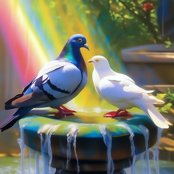 Улыбка радуги на солнце,С фонтана падает водаИ голубь резко встрепенётся,К голубке он спешит всегда.Перекликаются друг с другом,Ей клювом перья теребит,Одна у голубя подруга,Он ею вечно дорожит.