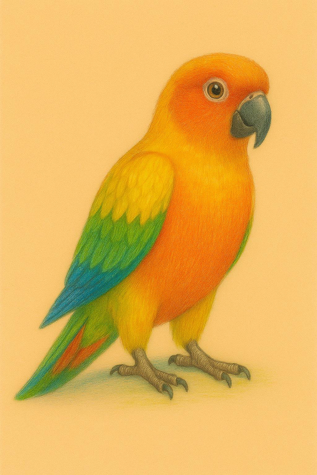 У Квилла ярко-желтый окрас, голова и живот оранжевые, крылья, хвост – зеленые. Он породы солнечной аратинга, весьма умен, сообразителен и умеет разговаривать. А еще я научила его разгадывать головоломки, покупала ему всякие деревянные головоломки, пазлы и всякие интерактивные игрушки.
