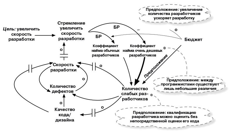 Более глубокий анализ системной динамики, который показывает, по какой причине разработка замедлилась в долгосрочной перспективе и почему первая версия Word для Windows была выпущена на несколько лет позже ожидаемого срока, представлен на рис. 2.3.