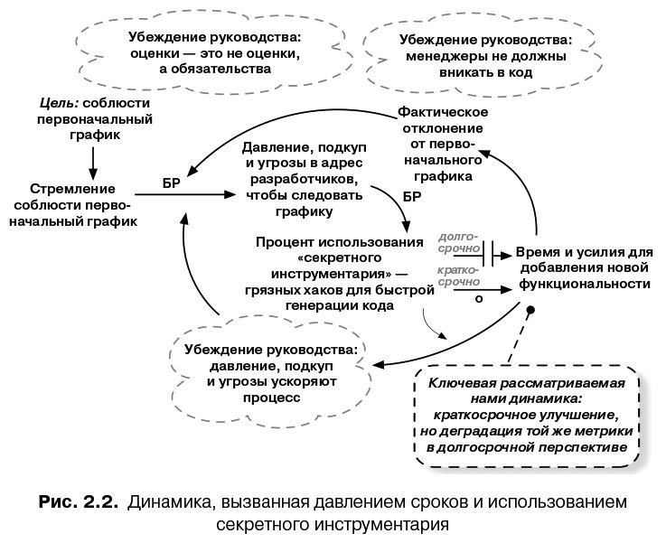 Поначалу казалось, что эта тактика обладает магическим действием. Чем настойчивее менеджеры давили на разработчиков, тем активнее те использовали свой секретный инструментарий и тем быстрее выпускались «фичи», что усиливало убеждение менеджеров, будто давление на разработчиков помогает. Но у этого обманчивого ускорения имелся отложенный эффект в виде долгосрочного замедления разработки (мы рассмотрим это чуть дальше). Развитие негативной динамики первое время оставалось незамеченным, поскольку последствия использования секретного инструментария проявились не сразу и руководство считало, что менеджерам не нужно самим быть опытными разработчиками, чтобы разбираться в деталях исходного кода или же регулярно проверять его состояние.