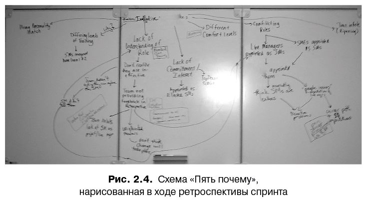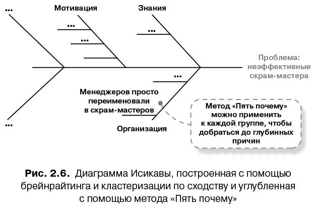 Метод «Пять почему» относительно неструктурирован; его можно комбинировать с диаграммами Исикавы (диаграммами «Рыбья кость») [Ishikawa86], чтобы организовать и связать причины, лежащие в основе проблемы, например такой, как неэффективность скрам-мастеров. Шаг первый – провести мозговой штурм по причинам проблемы; мы рекомендуем брейнрайтинг, когда каждый участник записывает свои идеи по одной на листочке бумаги и кладет эти листочки на общий стол. Шаг второй – кластеризация по сходству; нужно сгруппировать причины в семейства связанных причин и дать название каждой группе (рис. 2.5). Шаг третий – нарисовать скелет диаграммы Исикавы, где в качестве «костей» используются названия групп. Шаг четвертый – применить метод «Пять почему» к каждой группе или к заслуживающим внимания подэлементам каждой группы, чтобы выявить корневые причины. Все ответы нужно заносить в диаграмму, как показано на рис. 2.6.