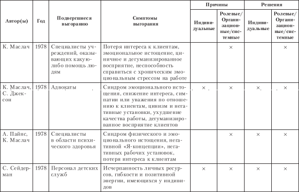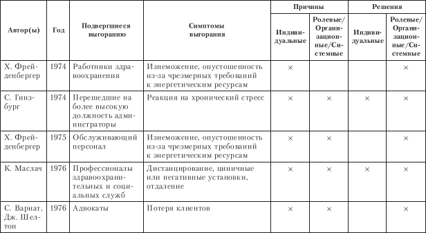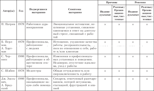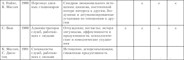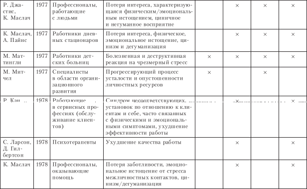 Перлман и Хартман провели сравнительный анализ и сделали обобщение опубликованных с 1974 по 1981 г. исследований по проблеме выгорания.[8] В результате авторы пришли к выводу, что большинство публикаций относятся к числу описательных исследований и только в некоторых содержатся эмпирический материал и статистический анализ данных. Систематизация публикаций, проведенная данными авторами, наглядно демонстрирует, во-первых, категории работников, у которых были обнаружены симптомы выгорания, во-вторых, многообразие и специфичность его симптоматики (табл. 1.6).