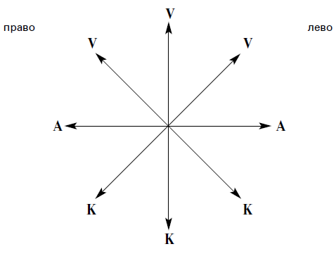 • Если руки двинулись вниз, значит, его сознание в этот момент времени обрабатывает кинестетические сигналы (К).