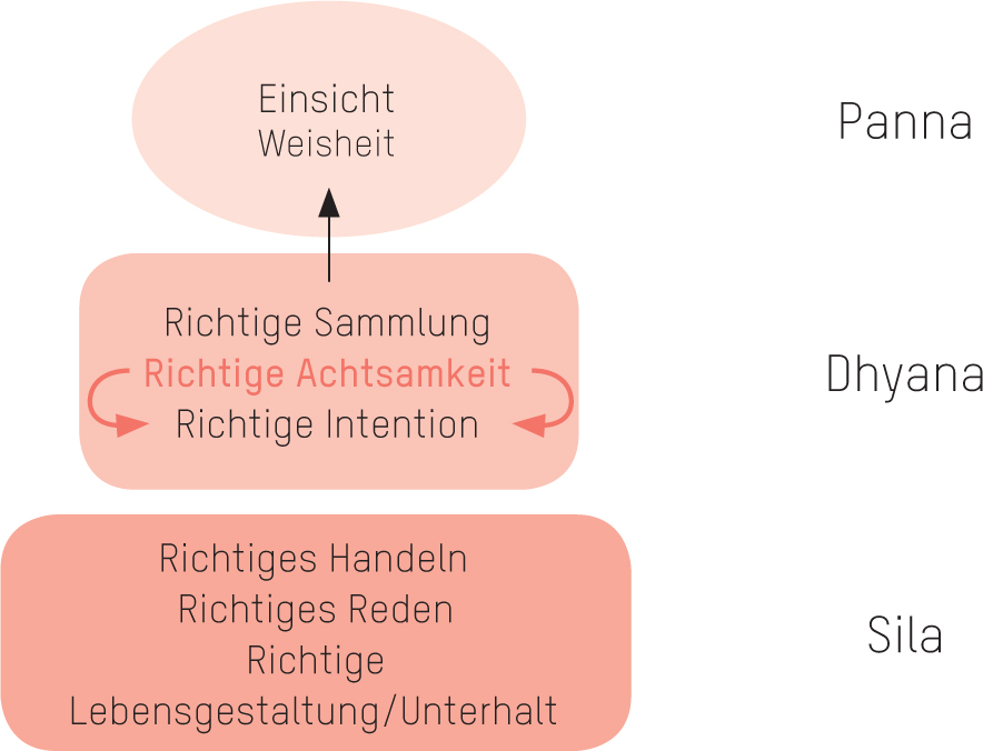 Intention, Achtsamkeit und Sammlung bedingen sich gegenseitig. Achtsamkeit, also die Fähigkeit, mit allen unseren Sinnen und Prozessen im Augenblick gegenwärtig zu sein, setzt die Fähigkeit zur Sammlung voraus. Umgekehrt erleichtert Achtsamkeit als Haltung die Fähigkeit, sich zu sammeln. All das ist aber wertlos und kann auch in eine destruktive Richtung gelenkt werden, wenn die richtige Intention fehlt.