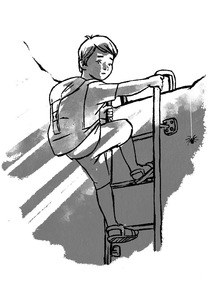 Als er sicher war, dass Oma und Opa fest schliefen, stand Domi vorsichtig auf. Er tastete sich leise aus dem Zimmer heraus zum Ende des Balkons.