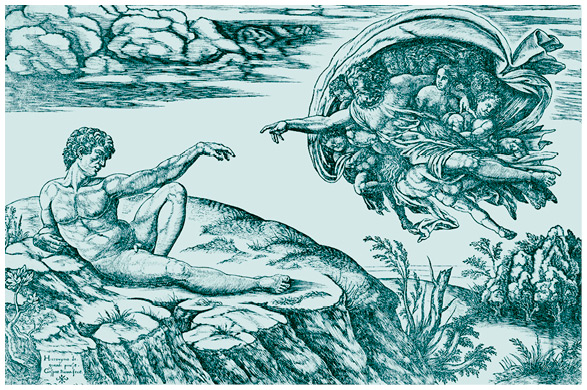 Седобородый Творец создает Адама: христианское изображение. Г. Руина по мотивам росписи Сикстинской капеллы М. Буонарроти, гравюра, ок. 1528–1533 гг.