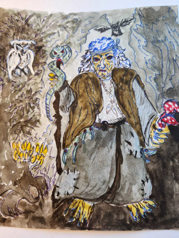 Вдоль озера тянется село Дольнее Белое, за ним непроходимый дремучий лес. Могучие корни вздыбливаются из-под земли, переплетаются с ветвями, сломанными и побитыми ураганами, что налетают внезапно с воющим ветром. Если удастся перейти чащобу, окажешься в неведомых странах. Но никому ещё не удавалось осилить дорожки-тропинки, запутанные, как ведьмины волосы. Это было тёмное царство старухи Меланьи. Одно имя её наводило страх и означало «чернота, тёмная». Здесь всегда царил полумрак. Застывший лес казался безжизненным. Ни звука, ни шороха. От этого ещё большая жуть охватывала заплутавшего человека. Он вдруг слышал странные громкие звуки, будто играли трещотки на сельском празднике. И едва путник, окаменевший от ужаса, уже прощался с жизнью, как вот она, жуть-то, и являлась. Старуха в чёрном одеянии. Седые космы выбивались из-под платка. На плечи накинута шаль, на которой, вместо кистей-украшений, извивались юркие змеёныши с «погремушками» на кончиках хвостов. Старухины скрюченные пальцы крепко держали клюку, вокруг которой обвилась «мамка» – гремучая змея, что вторила своими пластинами «детскому» оркестру – её треугольная голова с застывшими вертикальными зрачками, излучавшими красный свет, освещала путь Меланихе. Там, где ступали ноги ведьмы, земля застывала, и в прах превращалось всё живое, попавшее под тяжёлую поступь. Над её головой бесшумно описывали круги нетопыри. За свою «помощь» выбраться из заколдованного места, ведьма забирала душу навечно. Человек лишался разума и поступал в услужение. Сам виноват, не броди, не рыскай, где не следует. Но власть Меланихи простиралась и на родных путника. А если кто пытался забыть или отказаться от её «подарка», то вскорости гибнул от дикой стаи Волкопсов. Откуда появлялись эти звери – неизвестно. Нападали на домашний скот, да и человека могли загубить. Сотворив чёрное дело, бесследно исчезали, становясь невидимыми. Никакие ловушки и засады опытных охотников не действовали на этих оборотней.