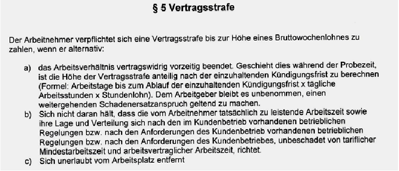 Der Tarif der christlichen Gewerkschaft wurde im Nachhinein im Internet gefunden, ausgedruckt und studiert. Er erwies sich rückständiger als der allgemeine gewerkschaftliche Zeitarbeitstarif. Auch der Arbeitsvertrag enthielt nach genauem Studium einige „Eier“ und zeigte sich in einigen Passagen unverständlich. So sollte bei einer vorzeitigen Kündigung eine Vertragsstrafe gezahlt werden!